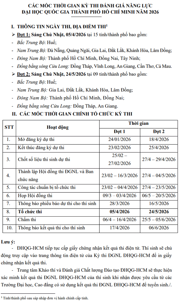 * Các mốc thời gian kỳ thi ĐHNL ĐHQG TPHCM năm 2026