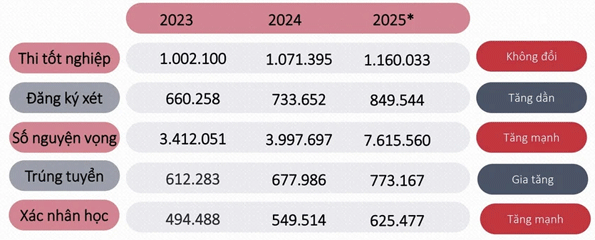 Dù vậy, tổng số thí sinh xác nhận nhập học đại học lại có xu hướng tăng đáng kể. Năm 2023, cả nước ghi nhận gần 494.500 thí sinh xác nhận nhập học; năm 2024 tăng lên 549.500 và đến năm 2025 là gần 625.500 thí sinh.