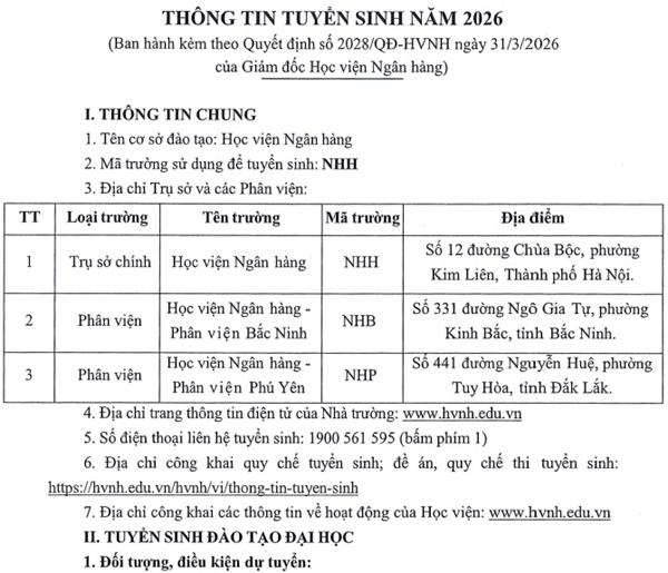 THÔNG TIN TUYỂN SINH ĐẠI HỌC CHÍNH QUY NĂM 2026
