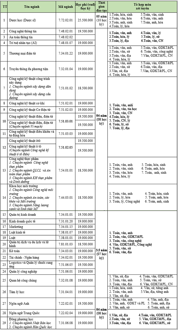 II. Ngành học và Tổ hợp môn xét tuyển hệ đại học chính quy