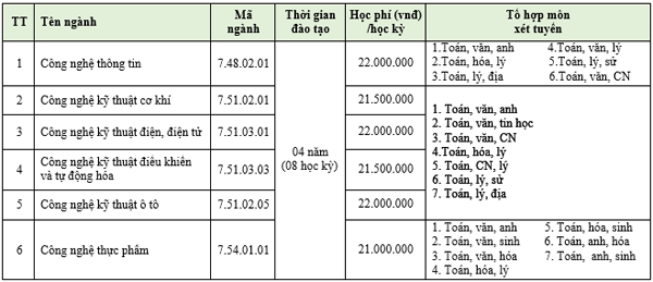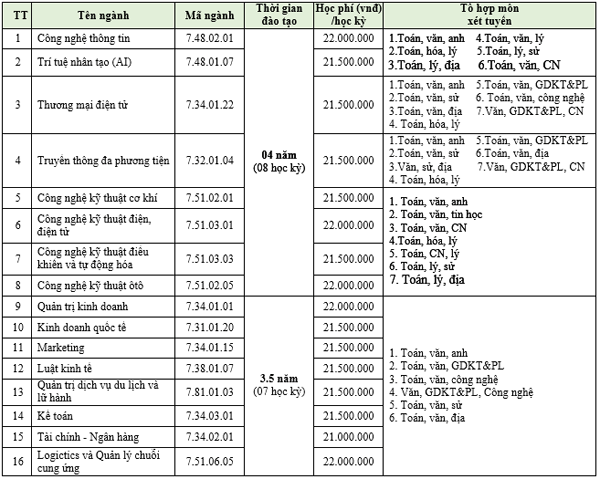 - Các ngành: Xét tuyển tổng điểm trung bình chung kết quả học tập cả năm các lớp 10, 11, 12 của 03 môn học trong tổ hợp môn xét tuyển