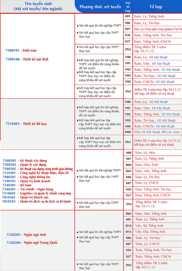 - Môn Toán đối với các ngành kỹ thuật, công nghệ, kinh doanh, quản lý, du lịch và các ngành: Kiến trúc, Thiết kế nội thất (nếu thí sinh ĐKXT theo tổ hợp A01, 3N2, X06, X07, X26, X27);