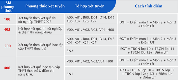 Sử dụng kết quả học tập THPT ghi trong học bạ hoặc Kết hợp kết quả học tập cấp THPT & điểm thi năng khiếu: