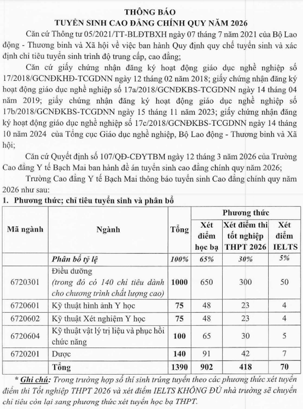 THÔNG BÁO TUYỂN SINH CAO ĐẲNG CHÍNH QUY NĂM 2026