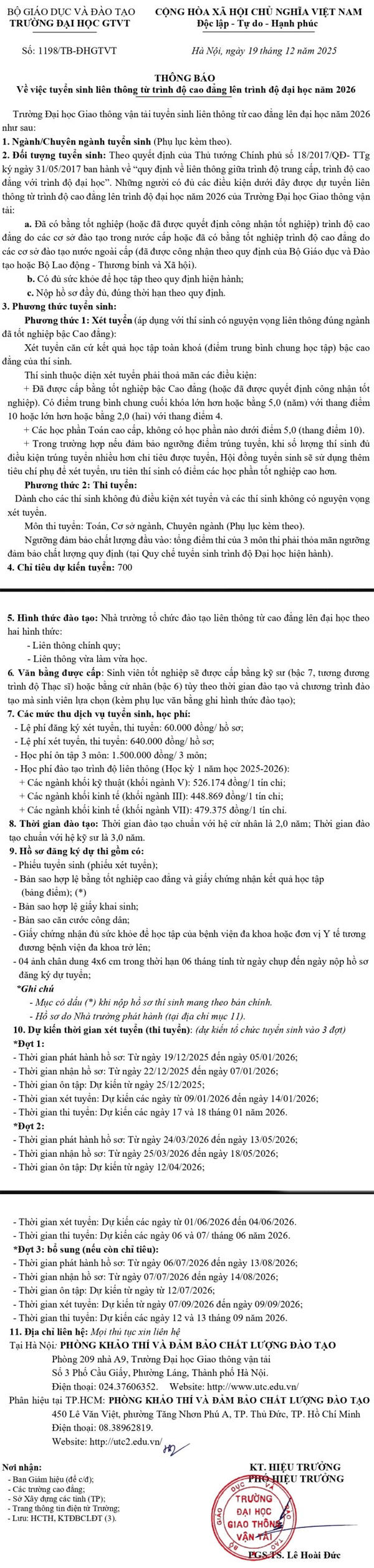 Trường ĐH GTVT tuyển sinh liên thông từ CĐ lên ĐH năm 2026