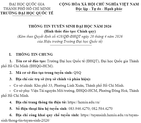 THÔNG TIN TUYỂN SINH ĐẠI HỌC NĂM 2026 (Hình thức đào tạo: Chính quy)