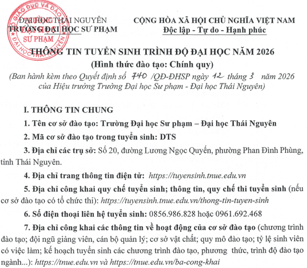THÔNG TIN TUYỂN SINH TRÌNH ĐỘ ĐẠI HỌC NĂM 2026 (Hình thức đào tạo: Chính quy)