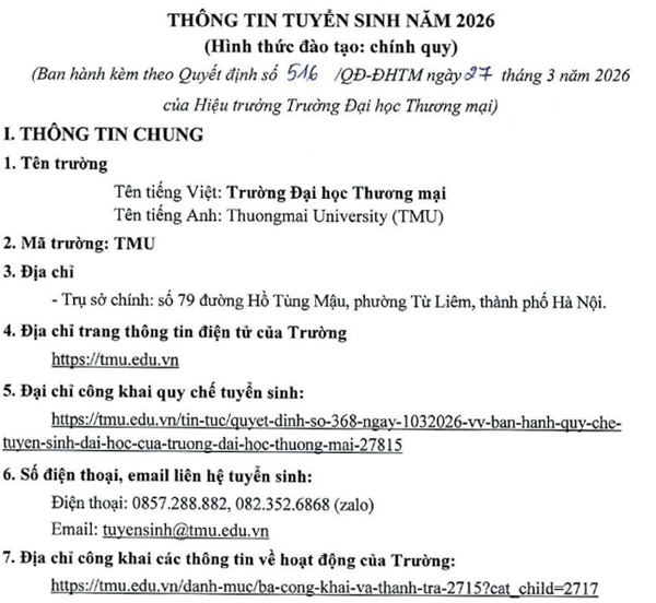 THÔNG TIN TUYỂN SINH ĐẠI HỌC CHÍNH QUY NĂM 2026