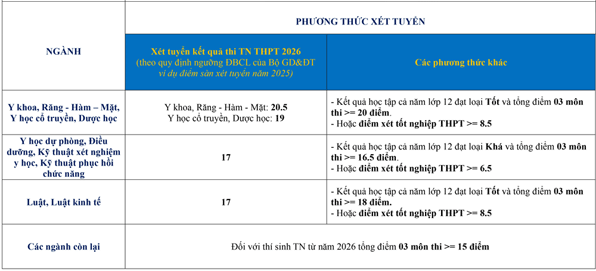 - Phương thức 1: Xét tuyển kết quả thi tốt nghiệp THPT 2026 theo tổ hợp môn.