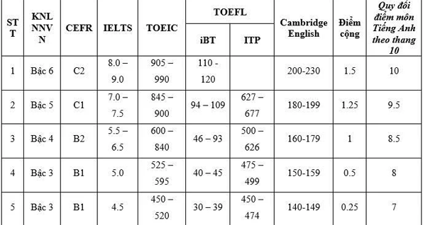 Bảng 2: Mức điểm cộng/quy đổi với thí sinh học THPT tại nước ngoài và có chứng chỉ tiếng Anh theo Khung Năng lực Ngoại ngữ Việt Nam