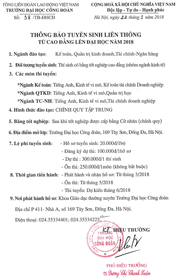 ĐH Công Đoàn tuyển sinh đại học liên thông năm 2018