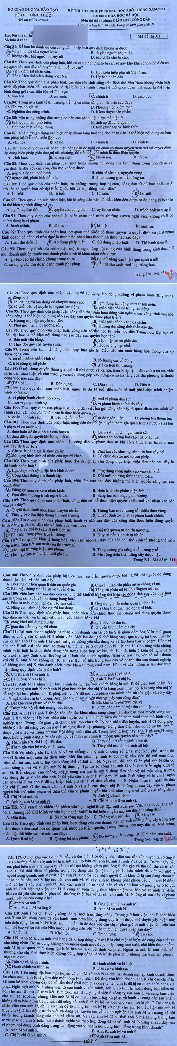 Đề thi môn Giáo dục công dân - Kỳ thi tốt nghiệp THPT 2023