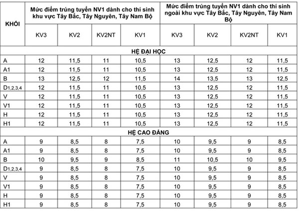+ Hệ Cao đẳng: Khối A, A1, D1,2,3,4, V, V1, H, H1: 10 điểm; Khối B: 11 điểm