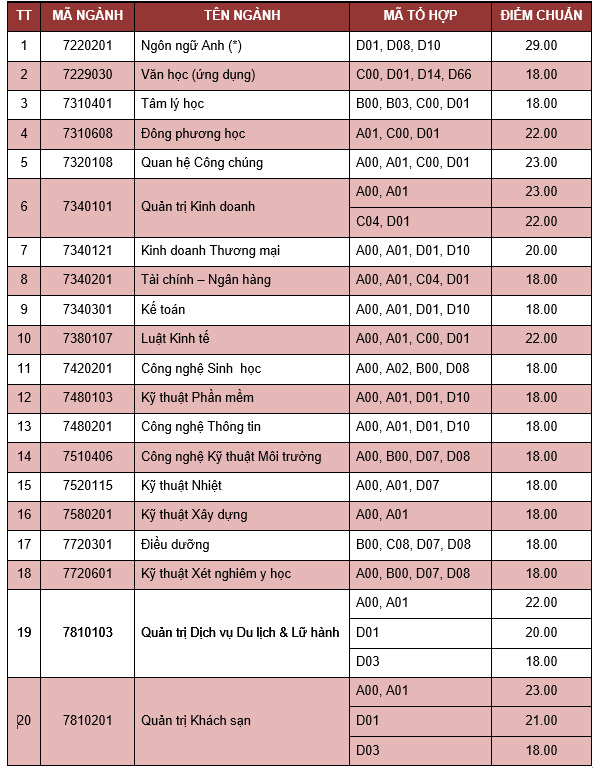 (*) Ngành Ngôn ngữ Anh: môn tiếng Anh nhân hệ số 2.