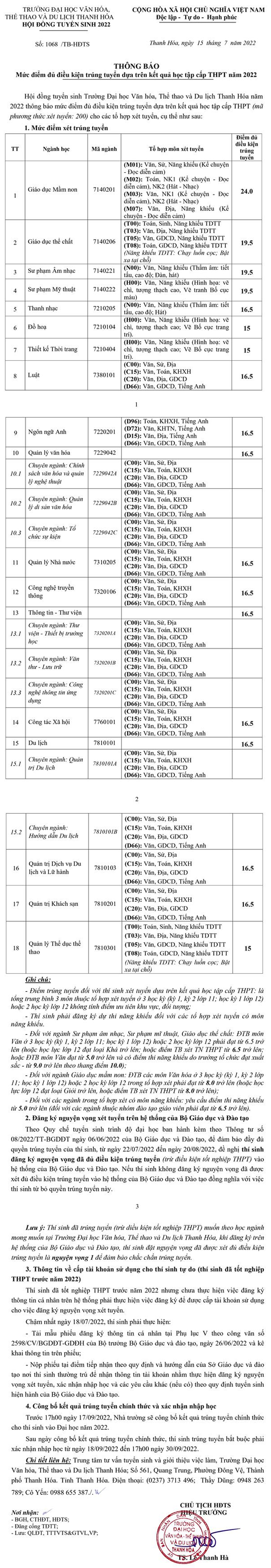 Điểm chuẩn 2022 theo phương thức xét học bạ THPT của Trường ĐH văn hóa Thể thao và Du lịch Thanh Hóa