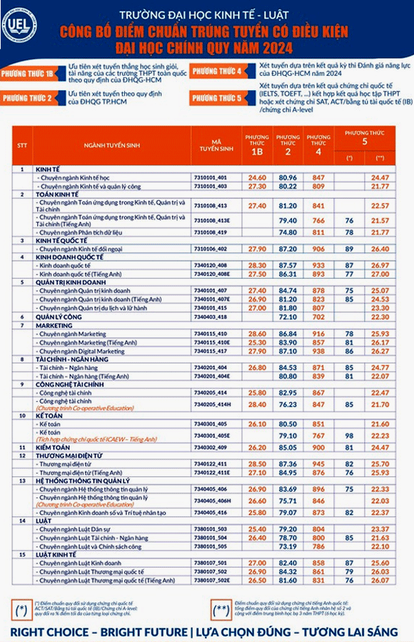 Điểm chuẩn 2024 theo các phương thức xét tuyển sớm của Trường ĐH Kinh tế - Luật