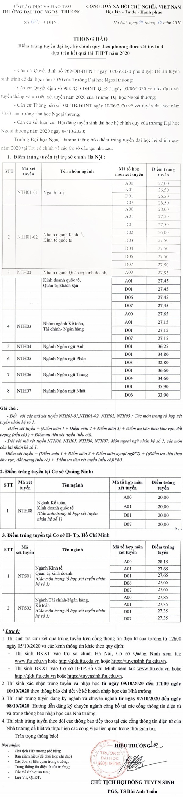 Điểm chuẩn năm 2020 của Trường Đại học Ngoại thương