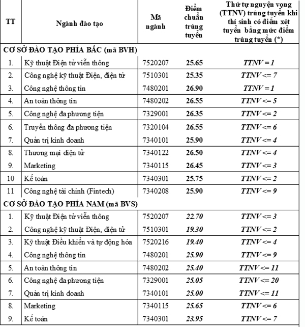 Điểm chuẩn năm 2021 theo xét kết quả thi TN THPT vào Học viện Công nghệ Bưu chính Viễn thông