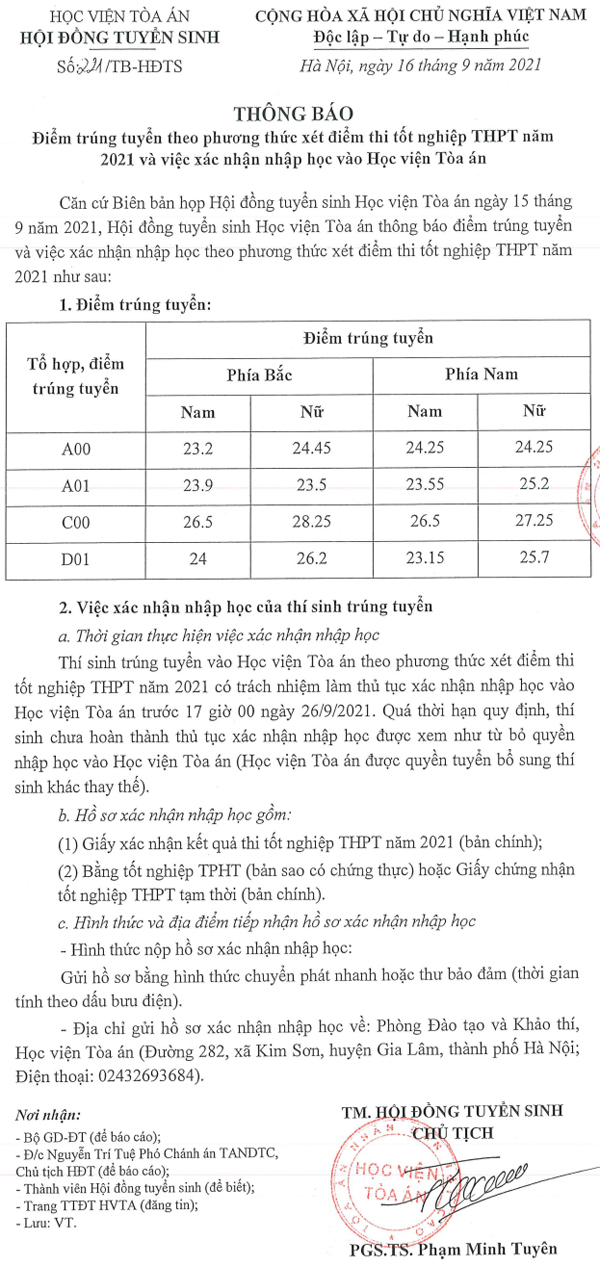 Điểm chuẩn năm 2021 theo xét kết quả thi TN THPT vào Học viện Tòa án