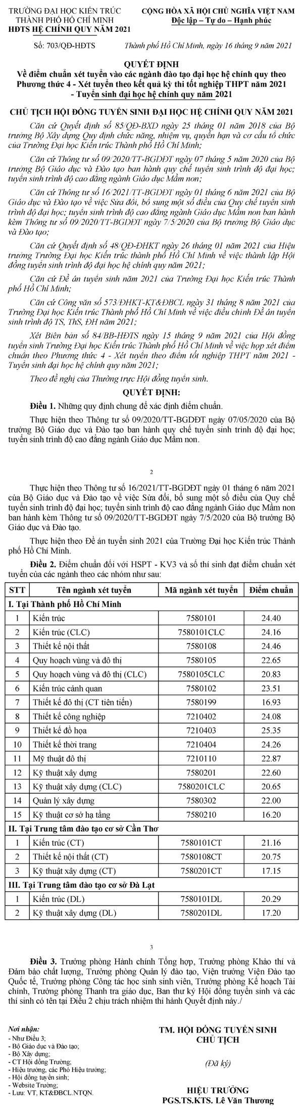 Điểm chuẩn năm 2021 theo xét kết quả thi tốt nghiệp THPT của Trường Đại học Kiến trúc TPHCM