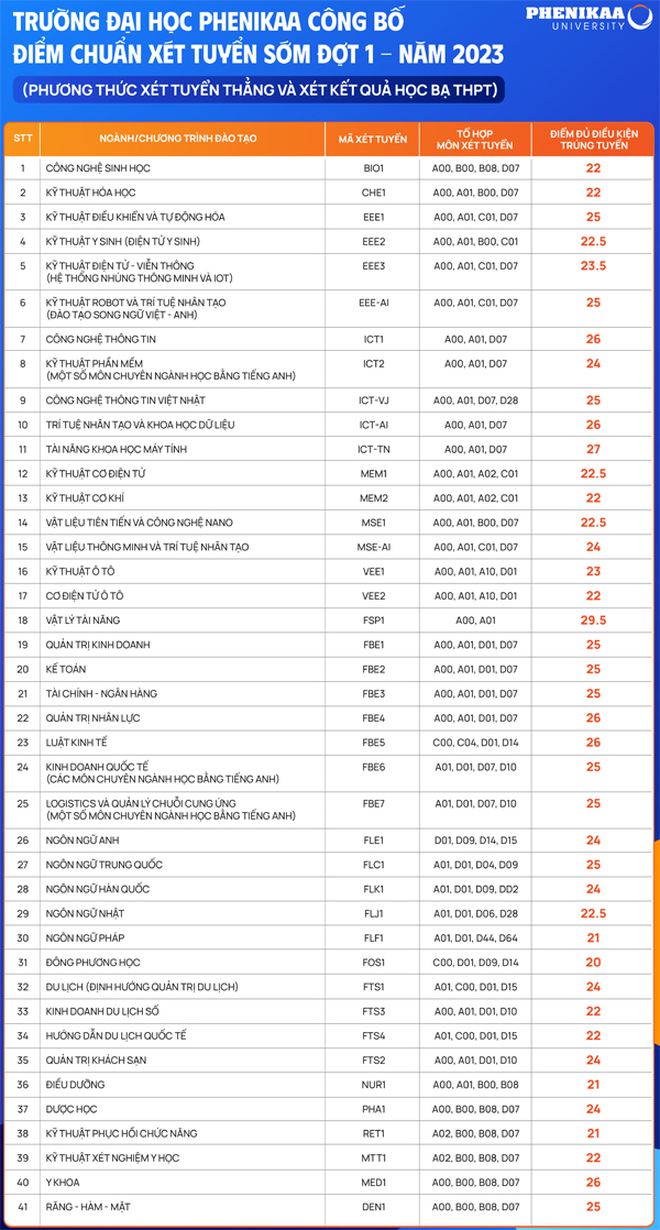 Điểm chuẩn năm 2023 theo phương thức xét Học bạ THPT của Trường ĐH Phenikaa