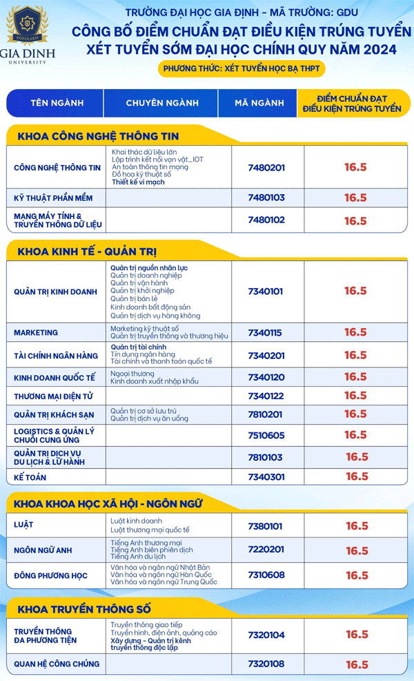 Điểm chuẩn năm 2024 các phương thức xét tuyển sớm (Học bạ & ĐGNL) của Trường ĐH Gia Định