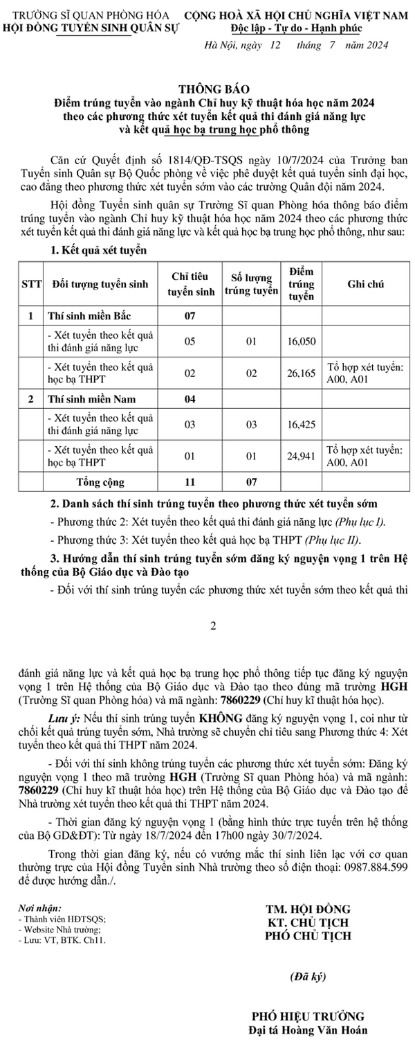 Điểm chuẩn năm 2024 theo phương thức xét tuyển sớm của Trường Sĩ quan Phòng hóa