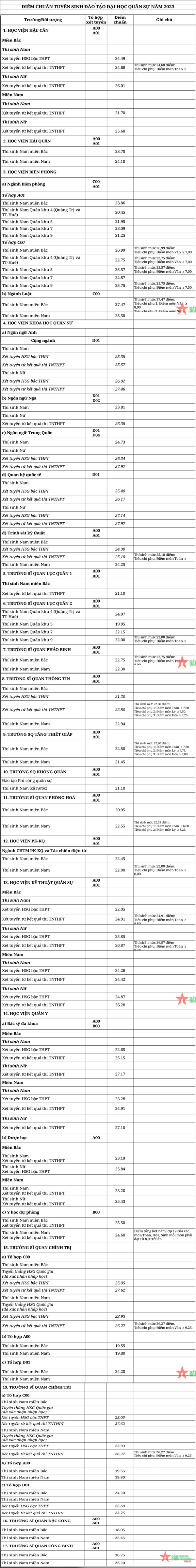 Điểm chuẩn trúng tuyển đại học vào các trường quân sự năm 2023
