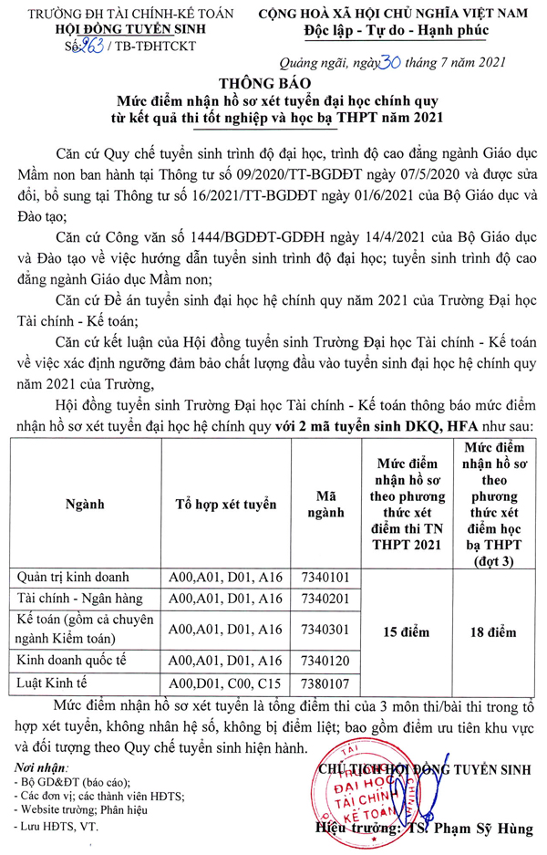 Điểm nhận hồ sơ ĐKXT 2021 của Trường ĐH Tài chính - Kế toán