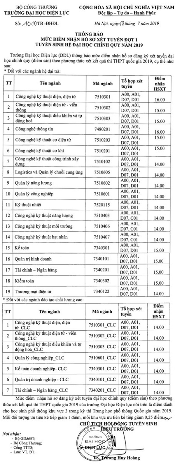 Điểm nhận hồ sơ ĐKXT năm 2019 của Trường ĐH Điện lực