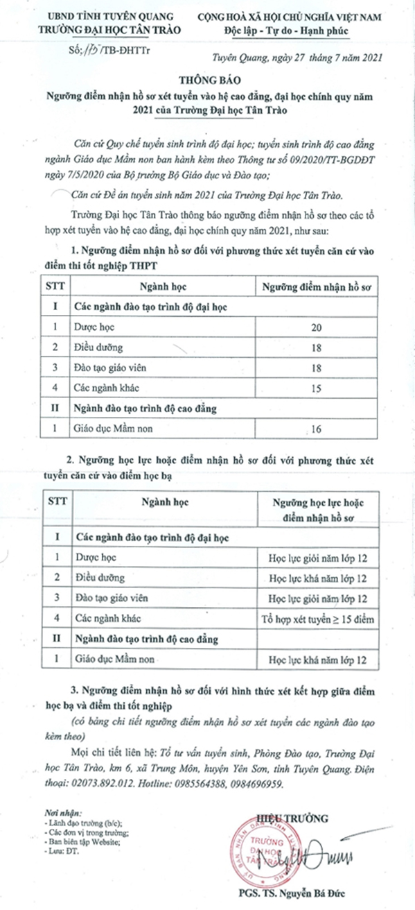Điểm nhận hồ sơ ĐKXT năm 2021 của Trường Đại học Tân Trào