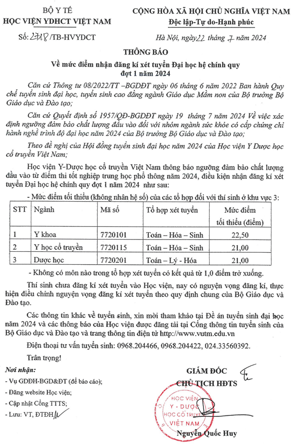 Điểm sàn ĐKXT năm 2024 của Học viện Y Dược học Cổ truyền Việt Nam