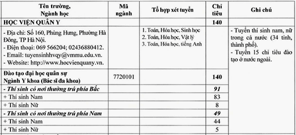 Chỉ tiêu và Tổ hợp môn xét tuyển của Học viện Quân y