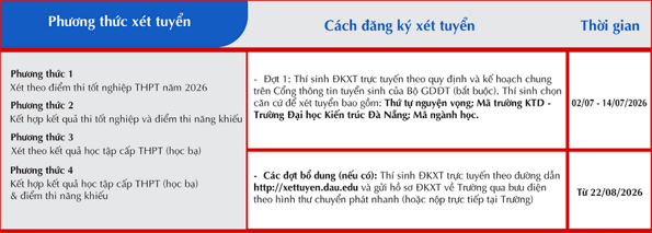 Thí sinh sử dụng kết quả thi tốt nghiệp THPT năm 2026 để xét tuyển. Trường Đại học Kiến trúc Đà Nẵng thực hiện theo quy định của Bộ GD&ĐT về thời gian xét tuyển, lệ phí xét tuyển, cách thức đăng ký. Thí sinh cần tham dự kỳ thi tốt nghiệp THPT 2026 và có điểm thi đạt từ ngưỡng điểm đảm bảo chất lượng đầu vào do Nhà trường quy định.