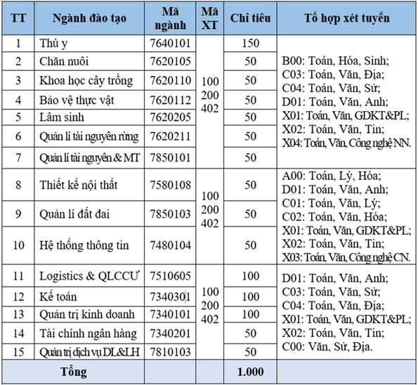 Năm 2026, Phân hiệu trường Đại học Lâm nghiệp tại tỉnh Đồng Nai (VNUF2) dự kiến tuyển sinh 1.000 chỉ tiêu trình độ Đại học chính quy cho 15 ngành đào tạo theo 03 phương thức xét tuyển gồm: