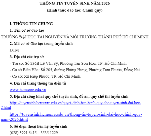 Trường Đại học Tài nguyên và Môi trường TP. HCM là trường đại học công lập đa ngành, có hơn 50 năm hình thành và phát triển, với triết lý giáo dục “Giáo dục toàn diện – Phát triển bền vững – Hội nhập quốc tế”.