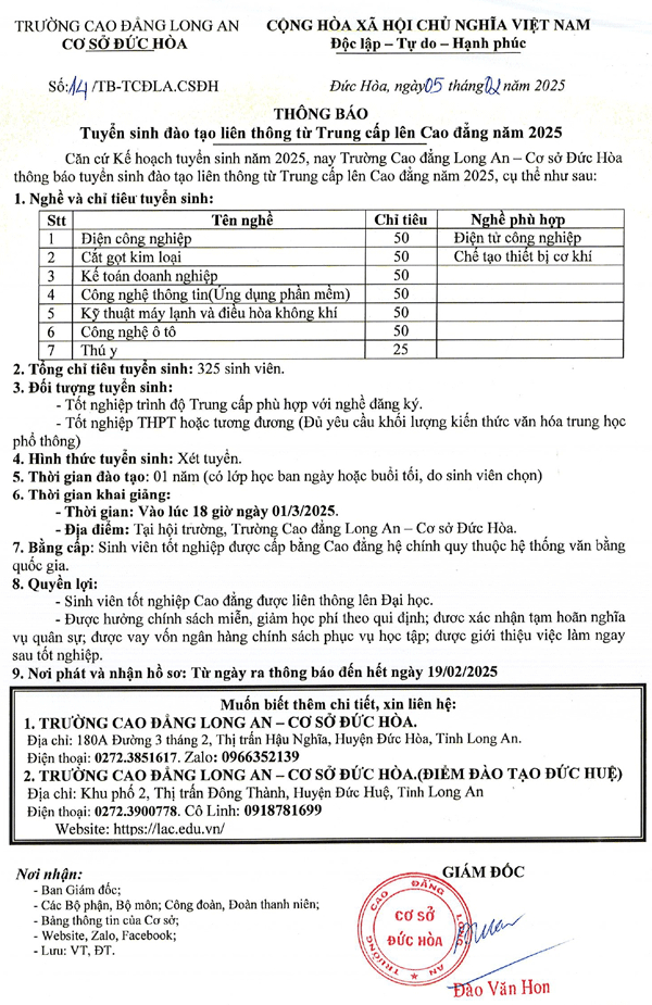 Ngày 03/03/2020 Bộ trưởng Bộ Lao động - Thương binh và Xã hội ký Quyết định số 245/QĐ-LĐTBXH sáp nhập Trường Trung cấp nghề Đức Hòa, Trường Trung cấp nghề Cần Giuộc, Trường Trung cấp nghề Đồng Tháp Mười vào Trường Cao đẳng nghề Long An và đổi tên thành Trường Cao đẳng Long An.